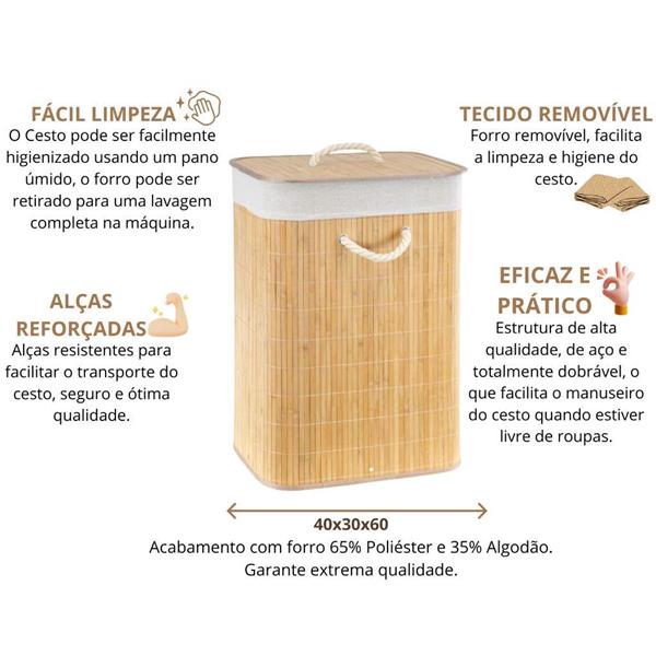 Produzido artesanalmente com bambu de alta qualidade, é resistente, durável e ecológico, adicionando um toque natural e moderno a qualquer ambiente. Possui tampa retangular e revestimento interno em tecido removível, facilitando a colocação e retirada das roupas.