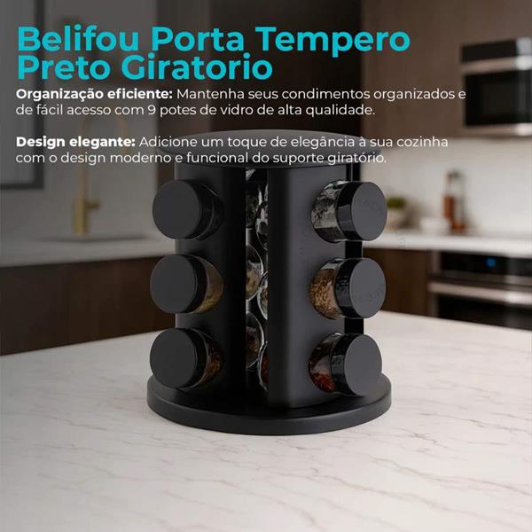 Praticidade giratória: O suporte giratório permite acesso rápido a todos os condimentos sem precisar tirar os potes do lugar.