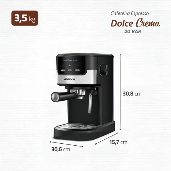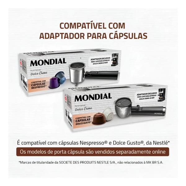 A Cafeteira Espresso Dolce Crema 20 Bar Mondial é perfeita para os amantes de um café encorpado e marcante. Com pressão de 20 Bar, ela extrai os sabores mais ricos e intensos do café moído, resultando em uma bebida cremosa e cheia de aroma. A Dolce Crema oferece versatilidade, permitindo a preparação de uma variedade de bebidas à base de café, desde espressos curtos e encorpados até lattes e cappuccinos cremosos. Além disso, a cafeteira também é compatível com adaptadores para bebidas de cápsulas, que são vendidos separadamente.