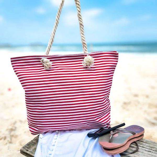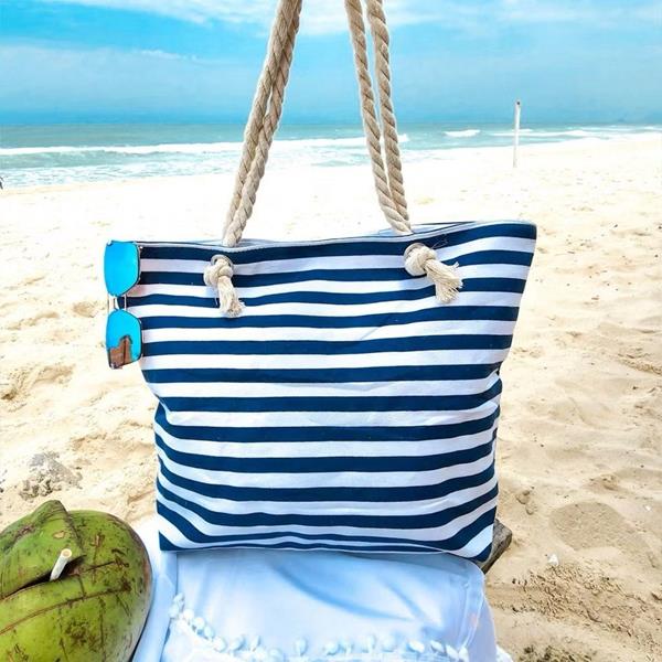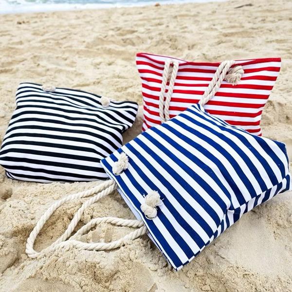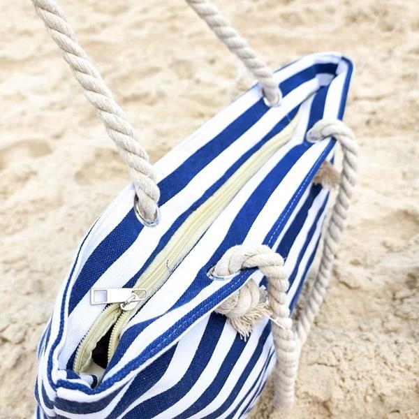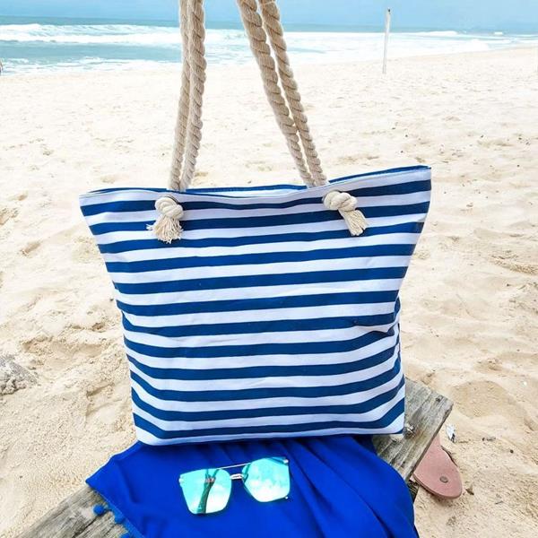 Que tal levar esta bolsa de praia de excelente qualidade? As listras estão super em alta. Ela é fácil de limpar, espaçosa, e nela você consegue levar sua canga, óculos, nécessaires com cosméticos, carteira e até mesmo sua viseira e chapéu.