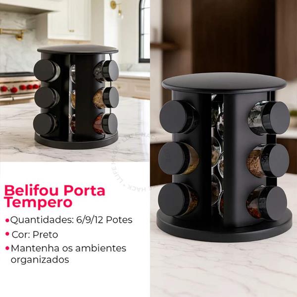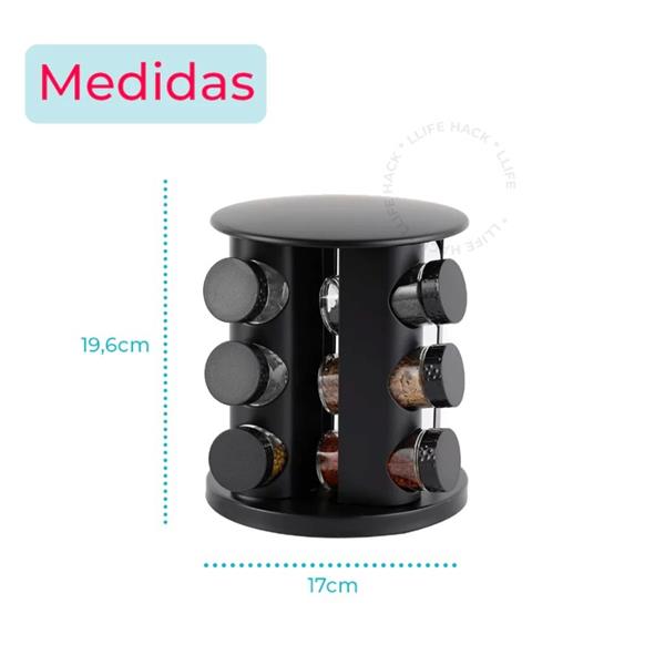 Praticidade giratória: O suporte giratório permite acesso rápido a todos os condimentos sem precisar tirar os potes do lugar.